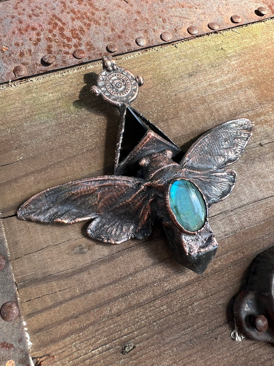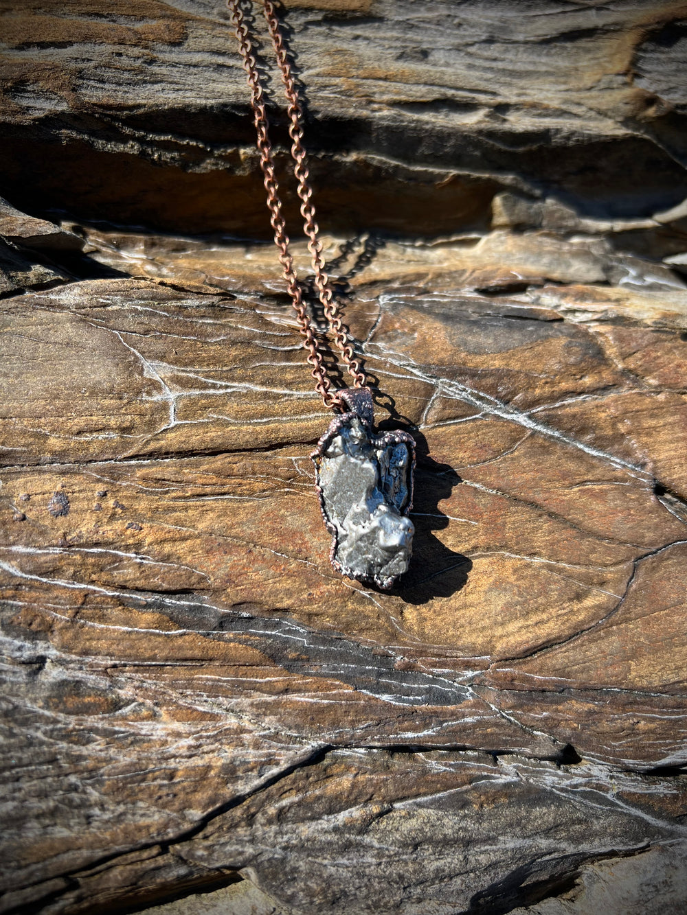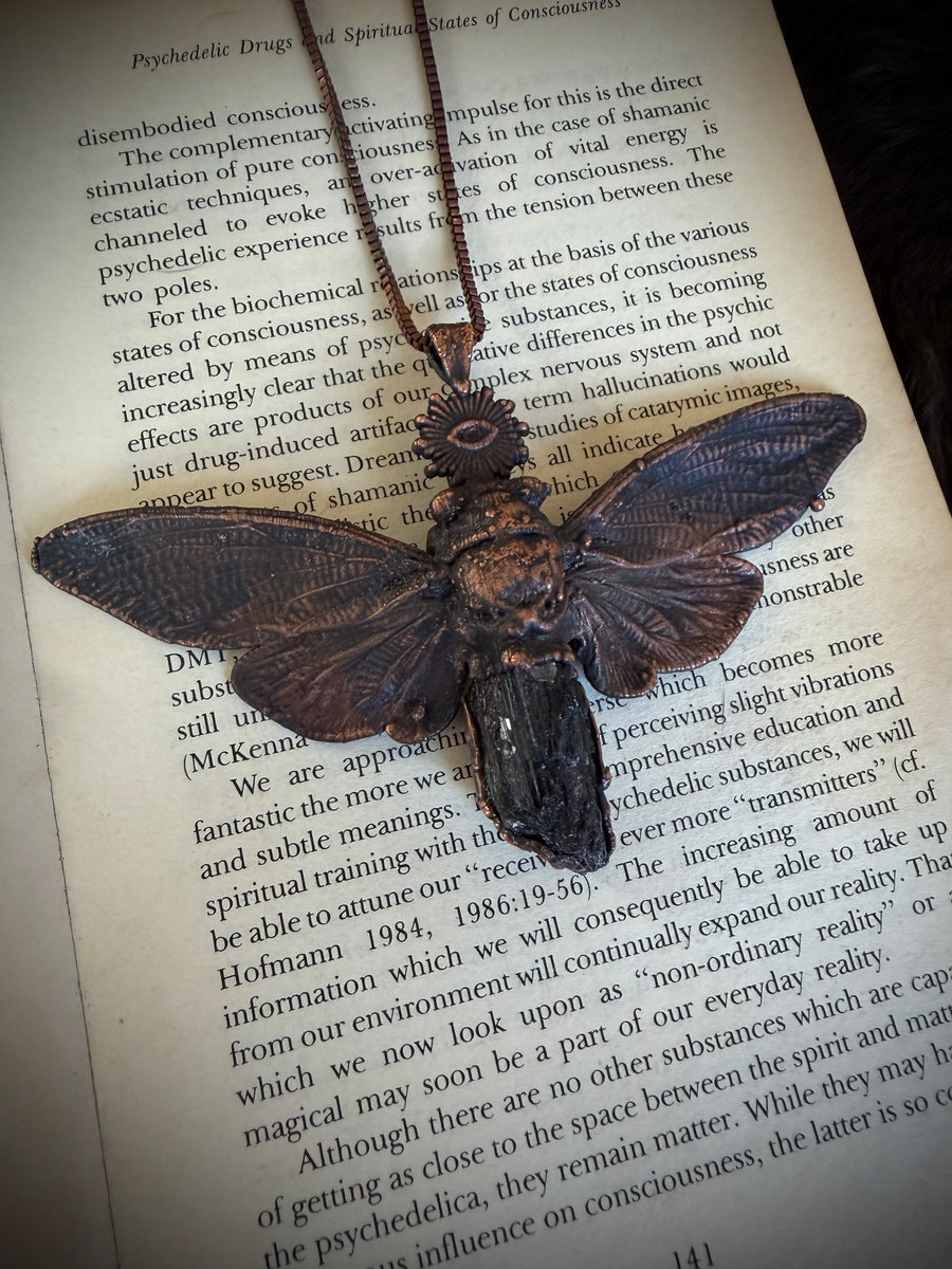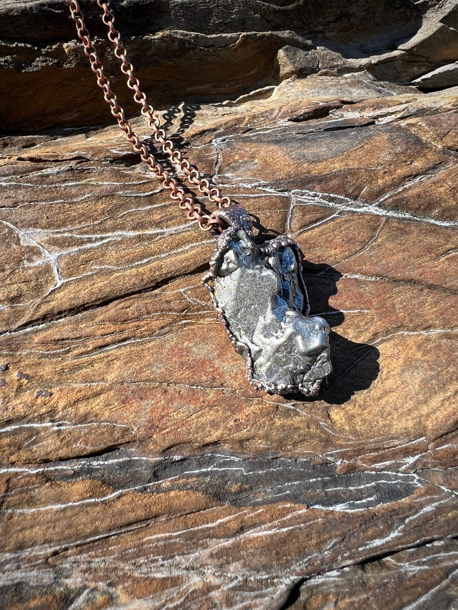 Prepare to be entranced by the alchemy of science and art, woven into divine, one of a kind talismans. Million year old fossils, high vibration crystals and powerful symbols are eternally preserved in copper through the process of electroforming. Adorn Your Temple 𓆃